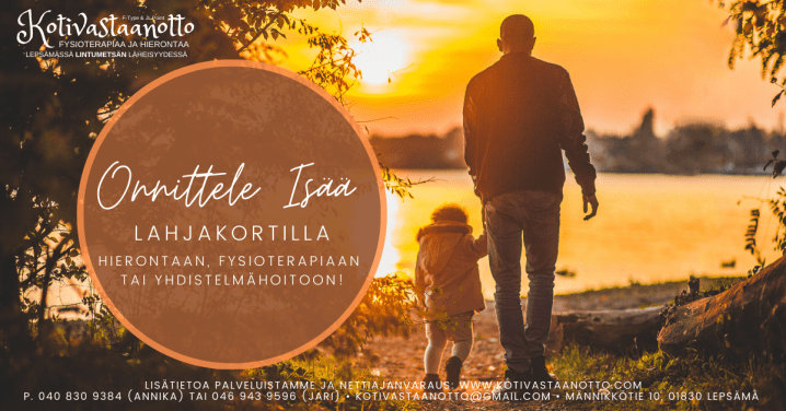 Isänpäivää vietetään 10.11. Jos isänpäivälahja on vielä hankkimatta, rentouttava tai kuntouttava lahjakortti hierontaan, fysioterapiaan tai yhdistelmähoitoon on mainio vaihtoehto! 🎁 ❤️