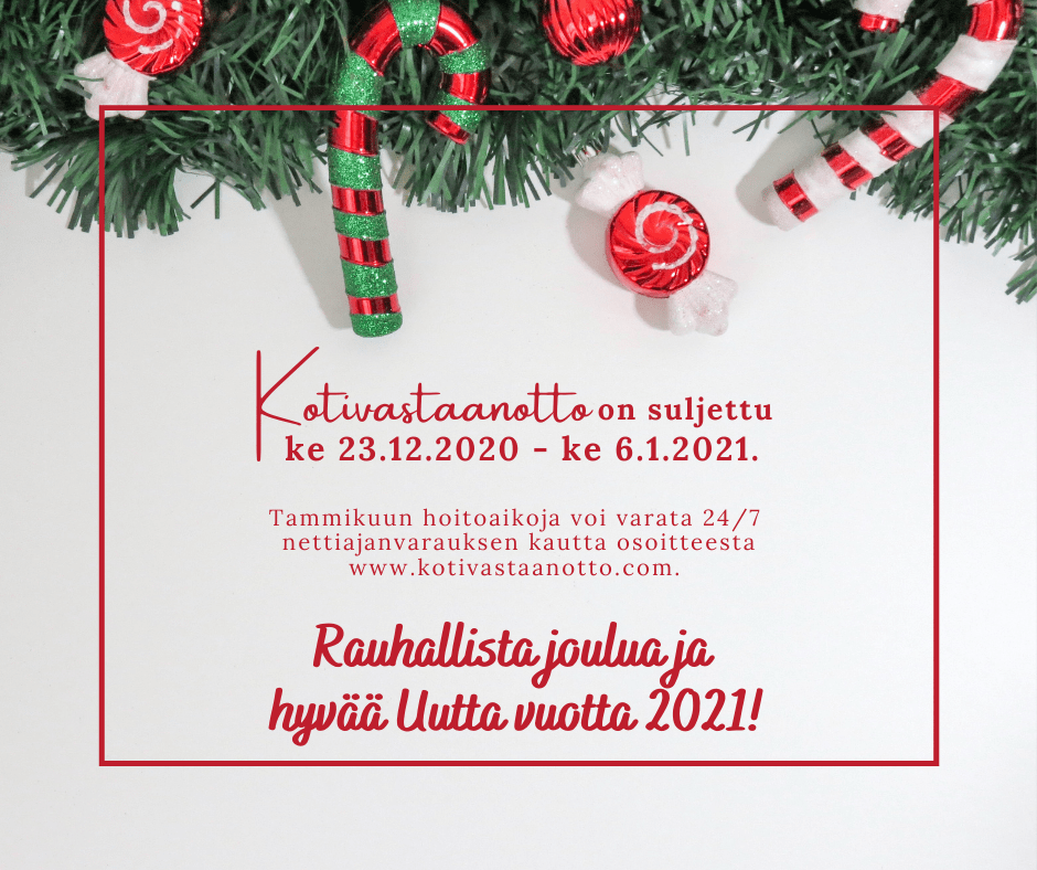 Rauhoitumme joulun ja uuden vuoden viettoon 23.12.20 – 6.1.21, mutta nettiajanvaraus palvelee tavalliseen tapaan.