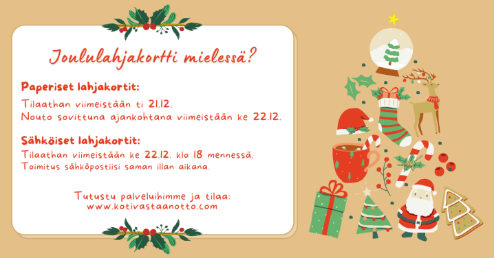 Jos joululahjakortit ovat vielä tilaamatta, otathan huomioon alla olevan tilausaikataulun. Joululahjakortit ovat voimassa 10.1. – 10.4.2022, joten voimassaoloaika ei ala kulua ostopäivästä, kuten tavallisilla lahjakorteilla. Saat laskulla tilatessasi automaattisesti maksuaikaa 5.1.2022 asti!